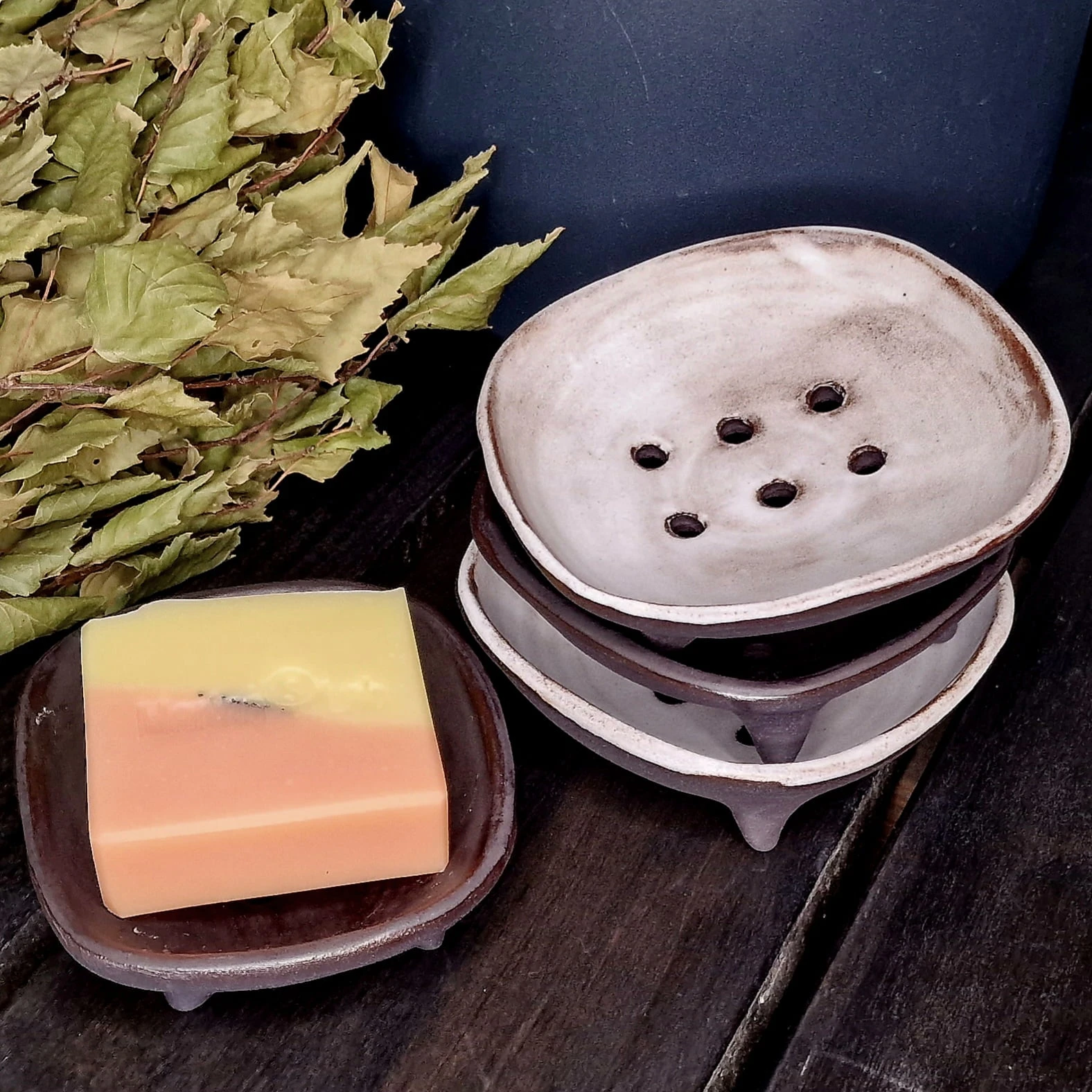 Tyylikäs keraaminen saippuakuppi jossa on kuusi reikää ja alla pienet jalat. Kuppi on valmistettu käsin mustasavesta. Sisäpuolella on silkinhimmeä lasite. Koko n. 11 x 11 cm ja korkeus n. 3 cm.